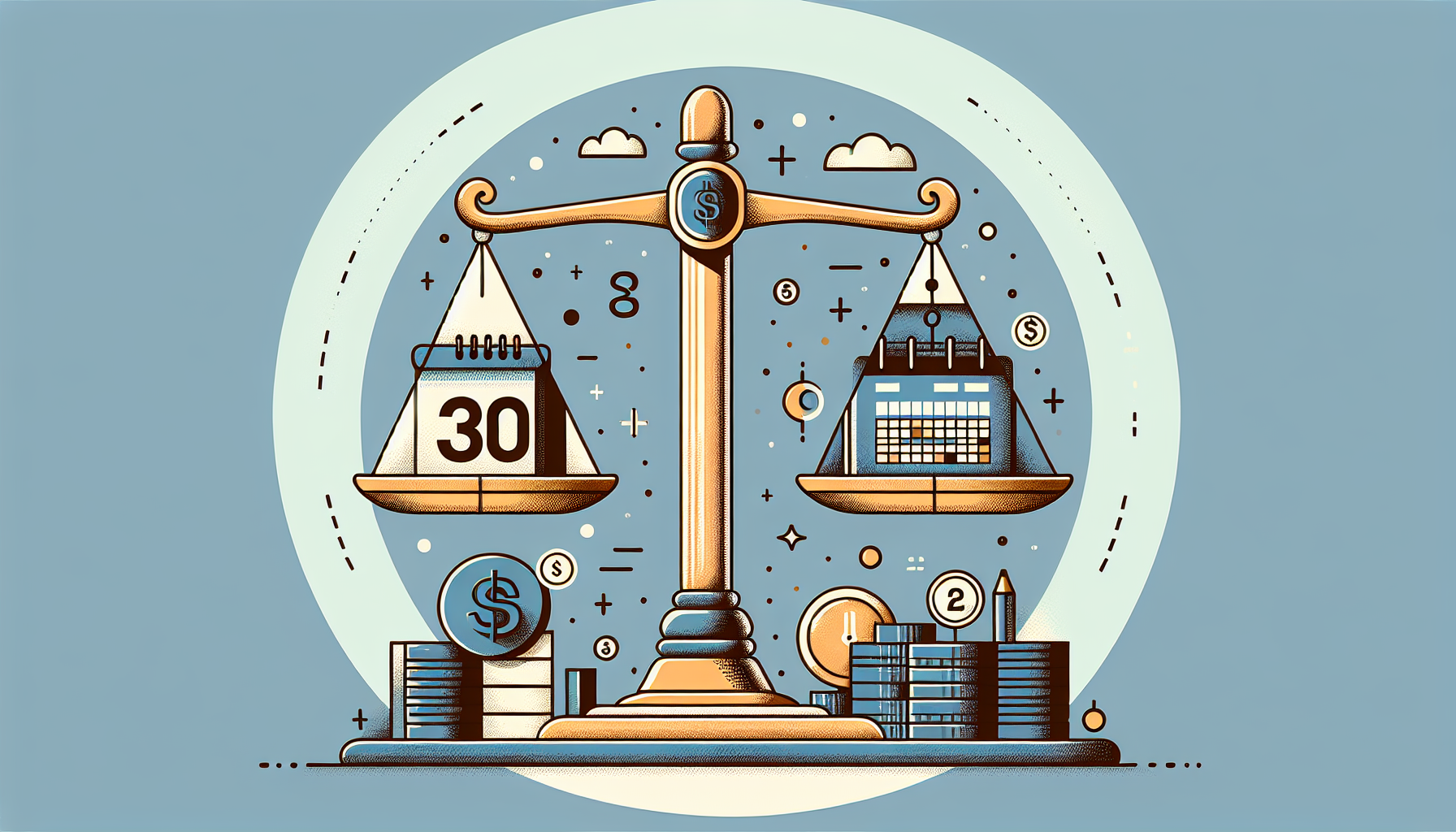 Illustration of a balanced scale with a calendar marked '30' on one side and a stack of coins and a calendar on the other, symbolizing the concept of Net30 tradelines and their impact on business credit and cash flow management.
