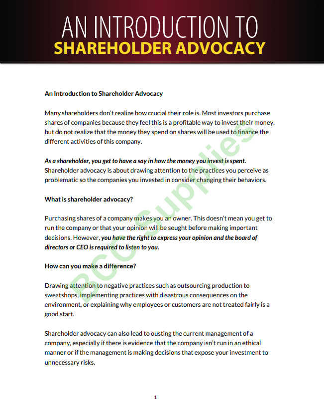 This eBook explores the role of shareholders in influencing corporate decisions and policies. It highlights how investors can engage with companies to address concerns and advocate for changes. With practical insights, it serves as a guide for those looking to make an impact beyond financial returns. Readers will learn how to navigate their rights as shareholders and use their influence effectively. Whether you’re a seasoned investor or new to the concept, this guide offers valuable perspectives on shareholder engagement.