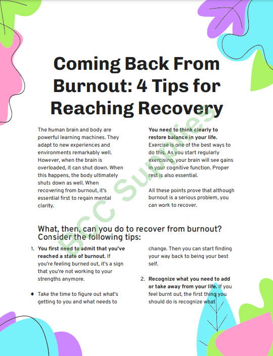 Coming Back From Burnout: 4 Tips for Reaching Recovery explores the causes and effects of burnout, emphasizing the importance of mental clarity, balance, and self-awareness. It highlights how burnout impacts both the mind and body and discusses key factors that contribute to exhaustion. The e-book offers insights into recognizing burnout, making necessary changes, and maintaining long-term well-being. Whether you’re struggling with overwhelming responsibilities or looking to prevent burnout in the future, this guide provides valuable strategies to help you regain control and restore your energy.